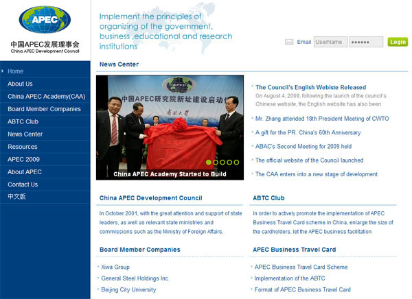 2009年8月4日,继中国APEC发展理事会中文网站上线之后,英文网站也正式开通,她标志着中国APEC发展理事会国际化宣传职能得到进一步的完善。