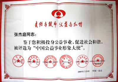 张杰庭先生因积极投身公益事业,促进社会和谐,被人民代表报、中国政策科学研究会、中国国际跨国公司研究会、世界华人协会、中国公益事业促进会和全国人大代表与优秀企业家高峰论坛组委会于2008年7月5日评选为“中国公益事业形象大使”。